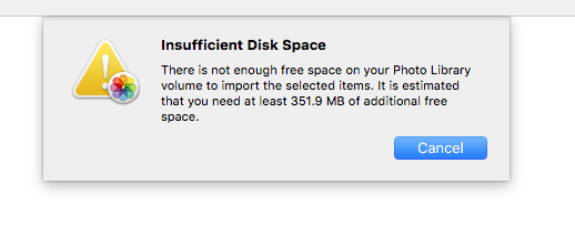 My iPhoto is empty however when trying to upload some photos from an SD card I get the message Insufficient Disk Space. So I tried importing some 8 GB of pictures to my mac but the Photos app is giving me the following message. Assuming your NAS is always available and connected to your iMac you can move both iPhoto and iTunes libraries to the NAS and use.